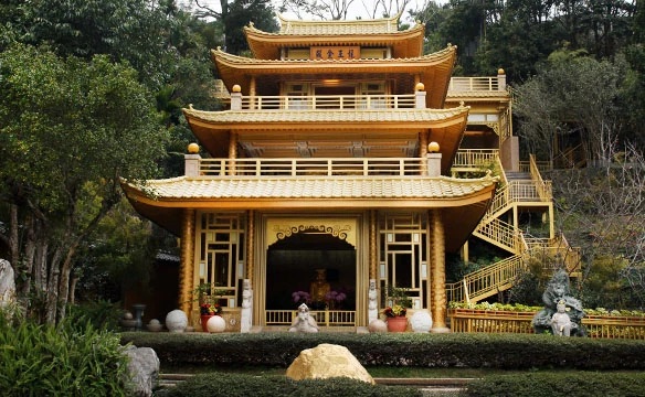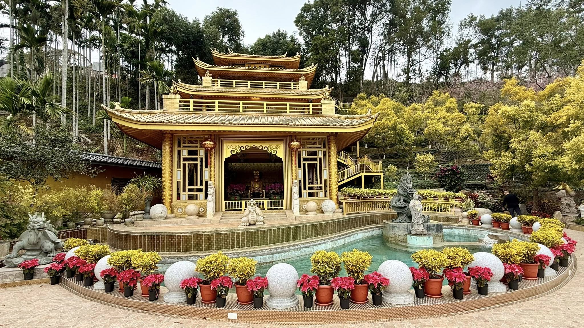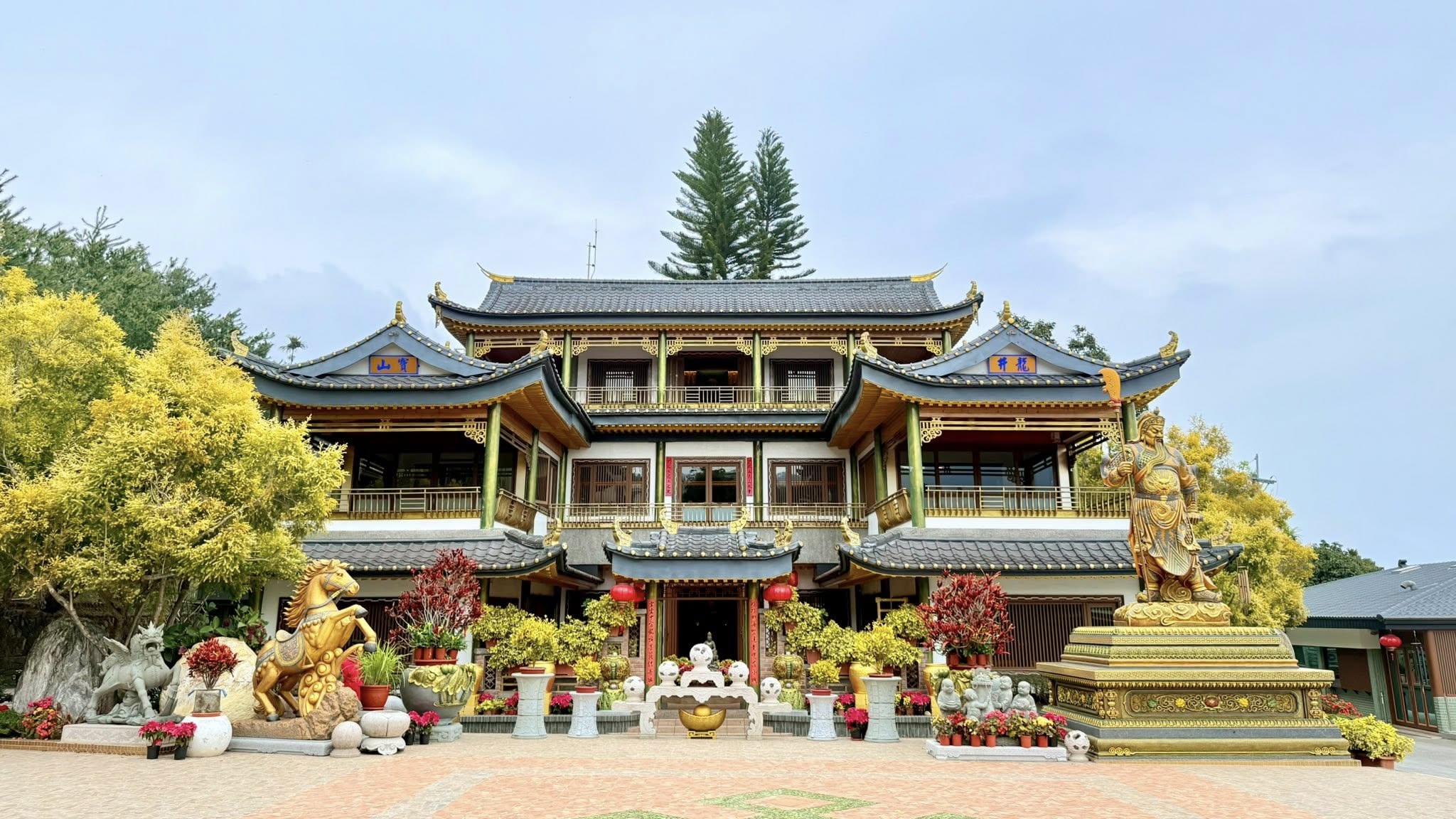 嘉義梅山龍王金殿由信徒簡巧雲女士發願興建,因感應「金龍王」保佑,在外事業有成後,遵循夢中指示於海拔約800公尺的梅山太興村,尋得泉水湧出之地,耗資多年打造而成。這座金碧輝煌的殿宇供奉金龍王,因外觀酷似日本金閣寺,被譽為「台版金閣寺」,成為當地熱門的清幽修行道場與觀光景點。