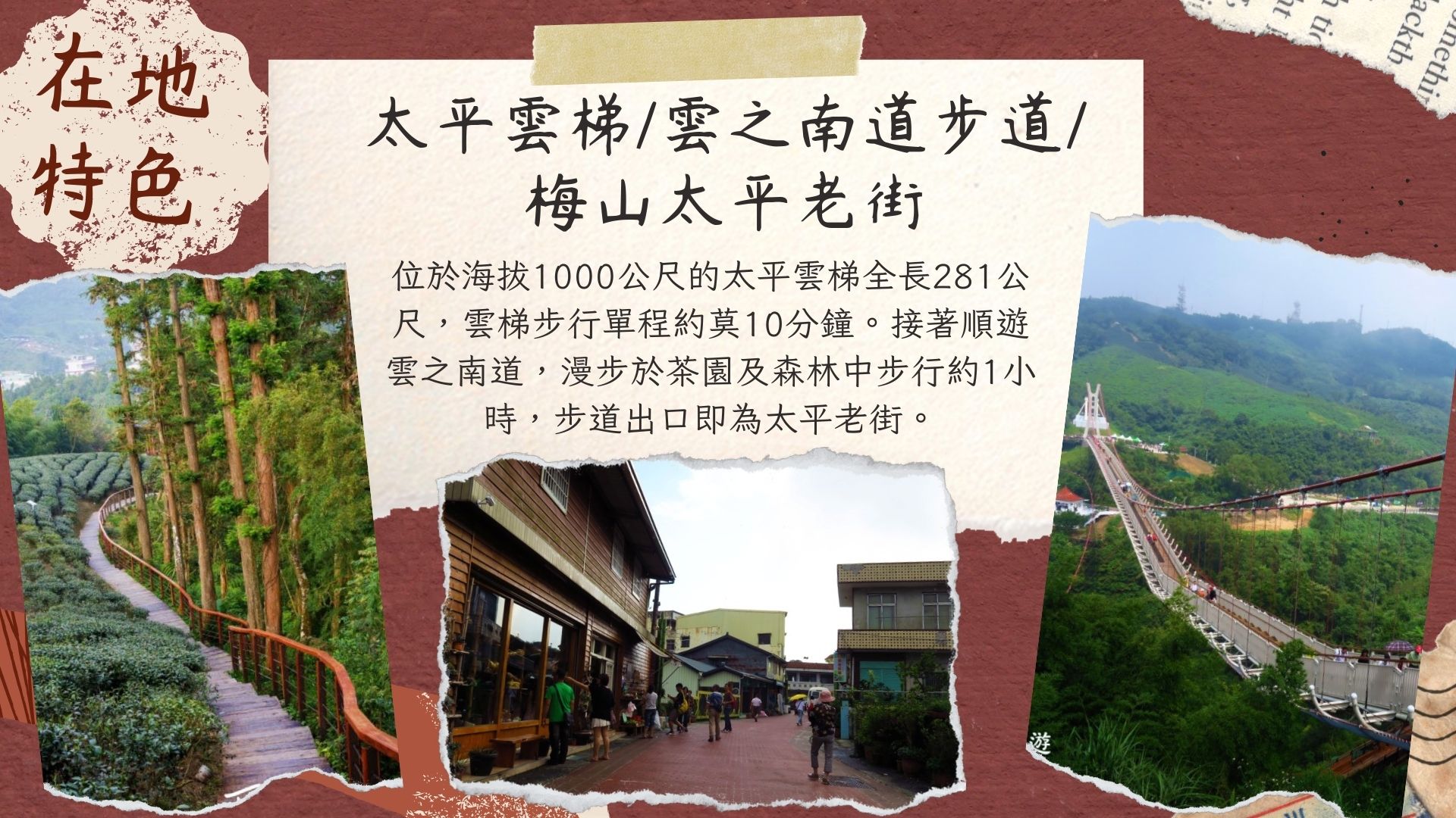 嘉義梅山太平老街擁有約 250 年歷史,是海拔約 1,000 公尺的山城聚落,早年為山產集散地與往來平地的交通要道。日治時期經歷「市區改正」形成如今兩側紅磚、巴洛克風格特色街屋,居民多懸掛公雞圖騰紀念文學家張文環,如今則結合茶文化、特色美食與太平雲梯,轉型為人文藝術商圈。